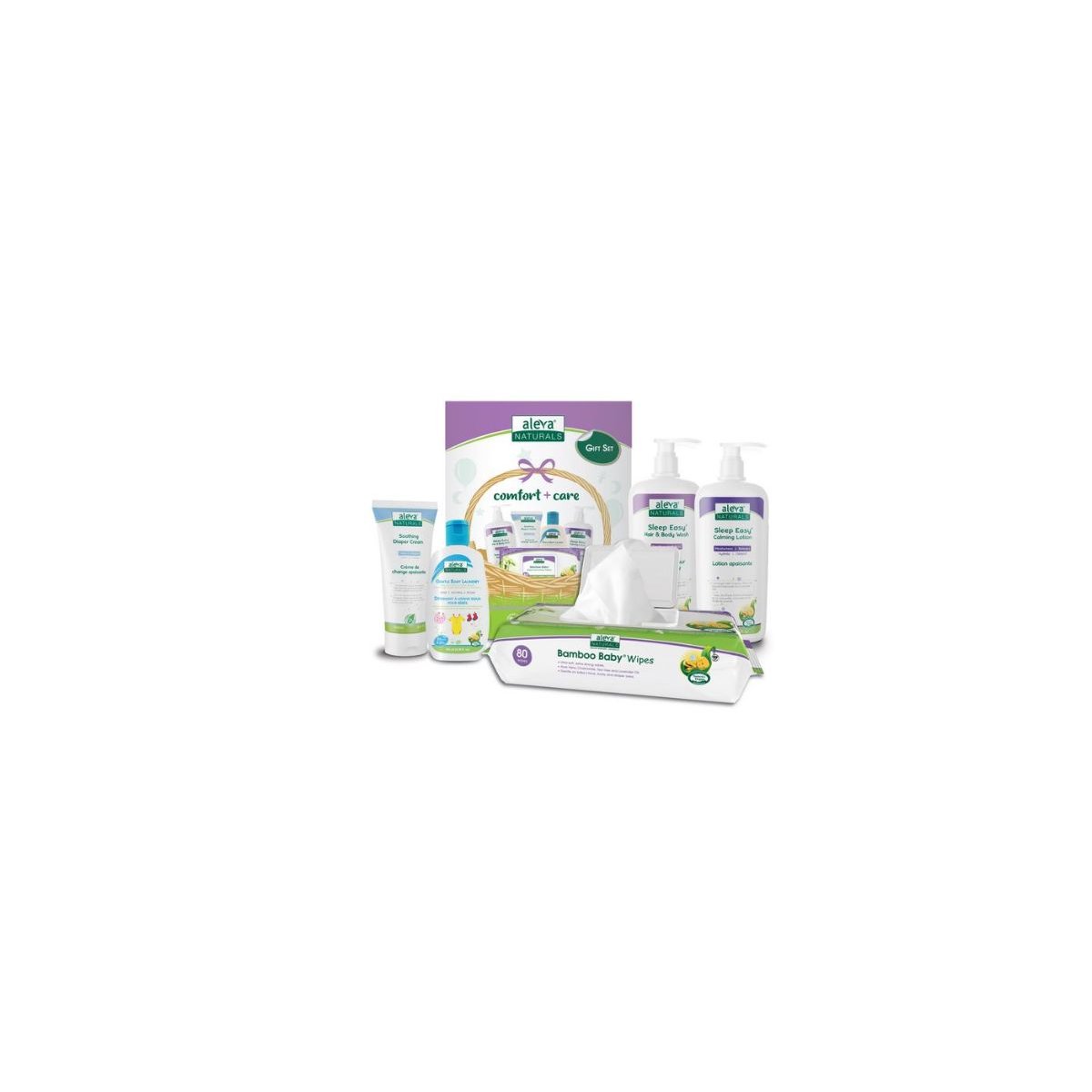 For gentle diapering care, the award-winning Bamboo Baby Wipes are specially formulated for baby’s sensitive and delicate skin, while the Soothing Diaper Cream is a smooth, non-greasy blend of Shea Butter, Aloe Vera and Natural Calendula extracts which provides a protective moisture barrier, leaving your baby’s bottom feeling soft and silky-smooth. For a relaxing bath and bedtime experience, the Comfort Care Gift Set includes two skincare items that are enriched with Lavender and Chamomile that release aromas to help calm baby to a restful sleep. The Sleep Easy® Hair & Body Wash is an ultra gentle wash while the Sleep Easy® Calming Lotion is the perfect lotion for massaging your baby as part of your bedtime routine. As an added bonus, the gift set includes a trial size of either the Bottle & Dish Liquid OR a trial size of the Gentle Baby Laundry as an introduction to our complete range of baby-safe and baby specific household cleaning products. A perfect introduction to the plant-based and citified vegan range and suitable for use from birth, give the gift of Aleva Naturals® with this Comfort Care Gift Set.