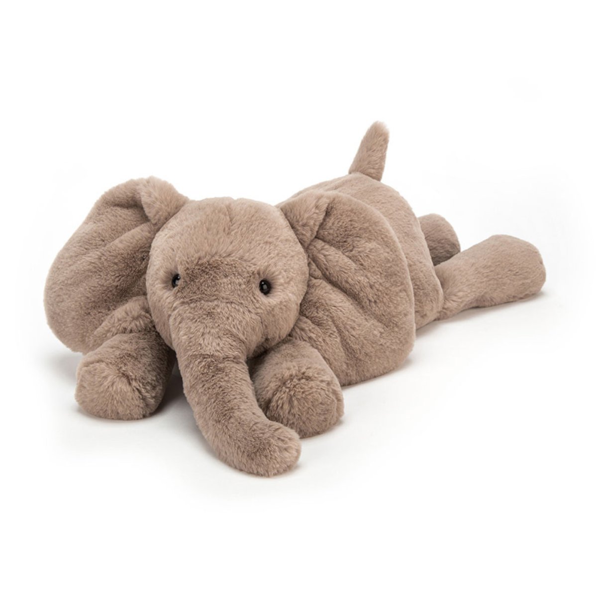 Smudge Elephant loves naptime and keeps falling asleep on the march Flop this supersoft silly down to sit on those squishable trumpet paws With warm grey-brown fur bright black eyes and great big fancy ears Smudge Elephant is an adorable dreamer Limited availability of Tiny Size