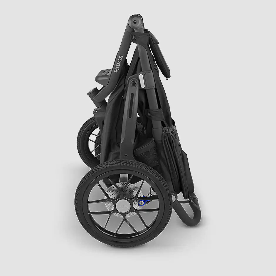 To fold the Ridge, first brake the stroller and ensure front wheel is unlocked. Rotate handlebar to the highest position to allow for a standing fold. Lift the foot flap up to expose the fold lever and button. Press and hold the button while twisting the lever and pull up towards the center. The handlebar will rotate down to the ground to stand upright.