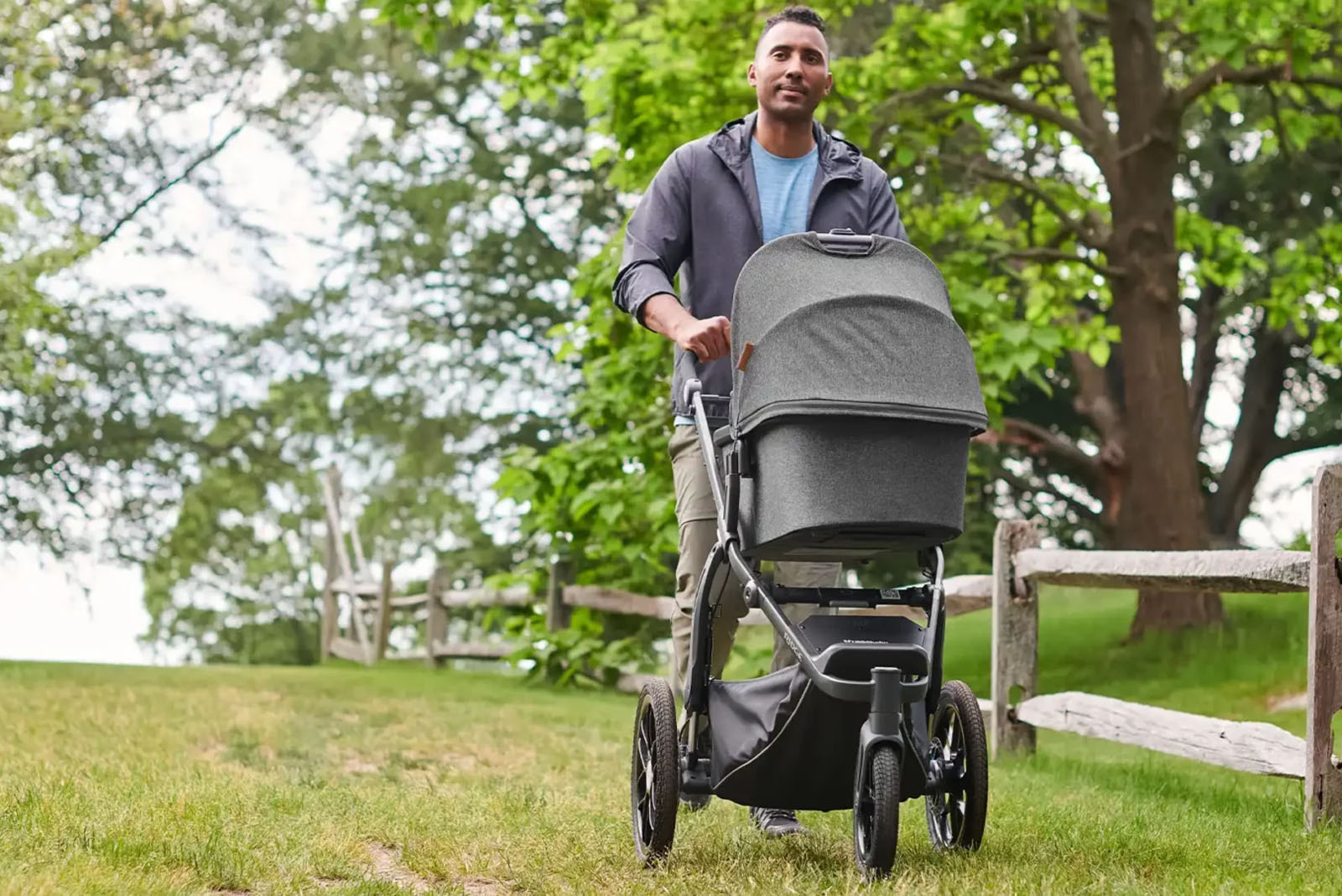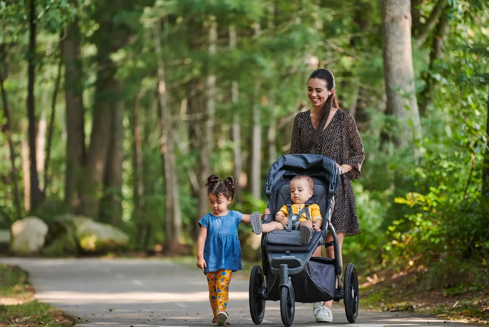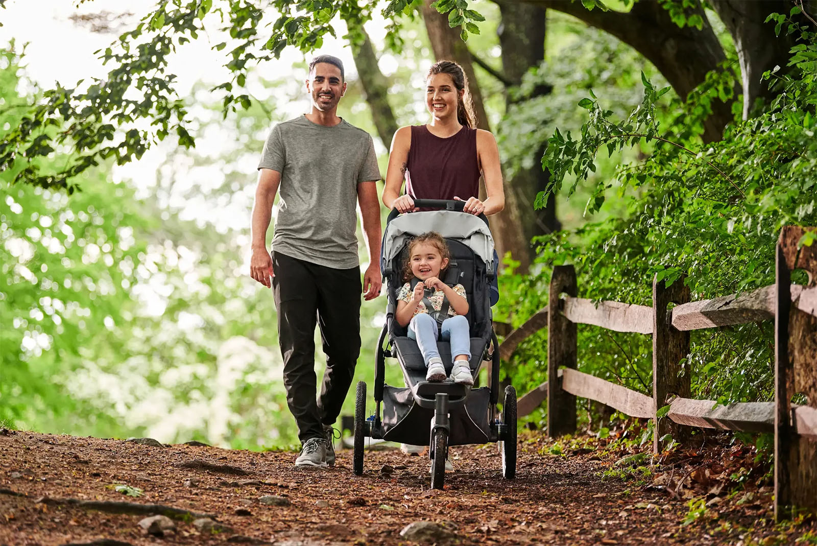 A responsive suspension system featuring variable coil springs keeps riders comfortable across terrains, no matter a child’s weight.